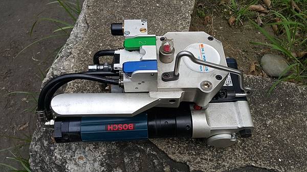 就是這台義大利進口HT32, PET塑鋼帶氣動打包機,馬達採用Bosch品牌, 而拉力可達6000公斤~, 可以使用PET帶寬度為19-32mm, PET帶厚度則為0.8 -1.3mm。
