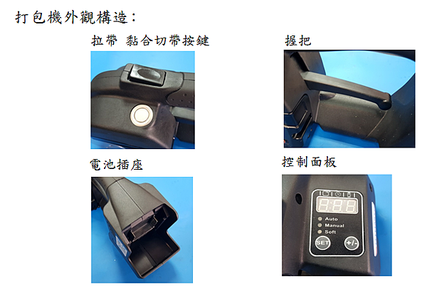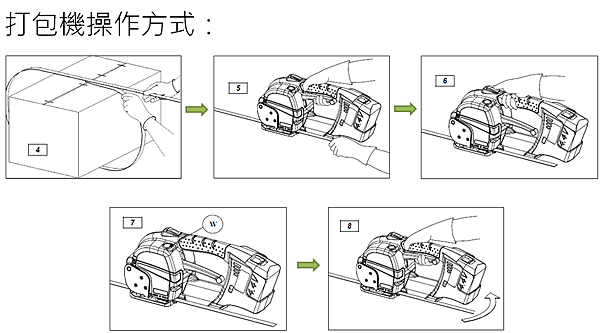 按下拉緊鍵不放,使打包帶拉緊到欲拉緊的緊度後,再